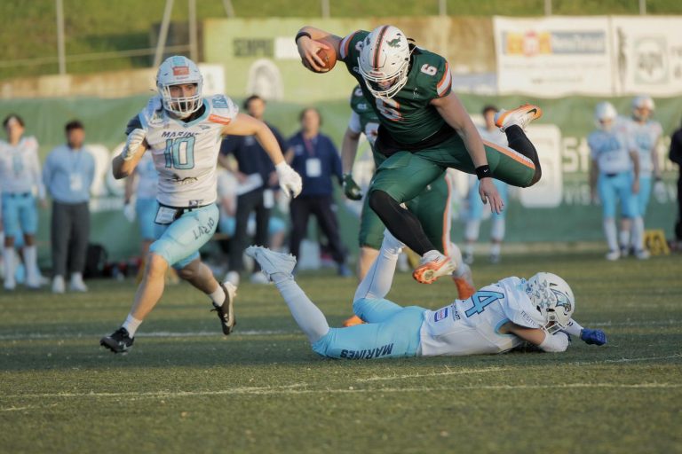 Prova vincente e convincente dei GLS Dolphins che sul terreno amico dominano i Marines Lazio al termine di una gara a senso unico. Entrambe le squadre sono scese in campo con le spalle al muro con Roma senza vittorie dopo aver gettato alle ortiche le tre gare disputate perse nelle battute finali, Ancona dopo il passo falso dell’esordio ha ceduto l’imbattibilità del Mandela a Parma a 9 secondi dalla fine e si è presentata in campo con importanti assenze prima di tutte quelle del qb Carter Cravens, stiramento per lui. Coach Parker ha deciso per la soluzione interna spostando Grodhaus in cabina di regia e l’offensive coach Aquinati ha dovuto riscrivere il playbook in dieci giorni per adattare schemi e blocchi al nuovo assetto. Risultato? Un capolavoro. E’ stata infatti la serata del giocatore dell’Ohio che ha segnato la gara in maniera memorabile segnando tre marcature personali su corsa , lanciando due passaggi in meta ed intercettando in difesa. Andiamo con ordine: primo drive dorico con Roma che inizialmente tiene sulle corse centrali ma paga poi quelle laterali con i ricevitori adriatici che bloccano a tutto campo. Al quinto gioco Grodhaus corre in meta in serpentina stretta dietro i blocchi della propria linea, partita impeccabile per i ragazzi di coach Gammelli, e con Brancaccio in versione fullback. 7-0 con Dazzani che centra i pali. I Marines con il qb Morgan provano un paio di corse ma vanno al punt. Palla ai GLS ed è nuovamente Cameren Ggrodhaus a dettare i tempi con corse e reverse smistate al rientrante Blackburn che ha mostrato di avere oramai riprese una forma quasi perfetta. La meta viene naturale, anche troppo velocemente, e siamo 14-0. Roma chiude con i bravi Alivernini ed Arca qualche down ma sono forzati al punt, un ottimo punt che costringe gli anconetani a partire dalle proprie 6 yds. Ma la mente dorica è fredda, lo sguardo vigile e gli assegnamenti chiari. Coach Aquinati chiama una trap che il qb dei Dolphins corre dietro i blocchi di un Brancaccio sempre “anima e core” che apre una voragine al centro della difesa capitolina. E così il giocatore veredeancio corre fino alla linea dei sogni come un bambino corre in discesa con il “Mandela” in piedi entusiasta. E’ uno “Show Cam”. 21-0. I laziali sono frastornati e provano a reagire arrivando a dieci yard dalla meta dove però il qb Morgan in un pass profondo trova l’intercetto ad una mano sempre dell’inesauribile Cameren. Applausi a scena aperta. Ecco però che Ancona pecca di presunzione. Il quarto drive, secondo quarto, non viene giocato con la cinica solidità dei precedenti ed il punt di De Jesus rimbalza male concedendo una nuova serie di giochi ai capitolini sulle 30 yds doriche. Roma stavolta non sbaglia e con una corsa di Alivernini ed il calcio di Impallomeni ricuce lo strappo 21-7. I Delfini ripartono con cipiglio e dopo un lancio su Orlandini ed una corsa di Brancaccio il coaching staff dorico legge la difesa ospite molto attenta alle corse e chiama un lancio in profondità dove Blackburn brucia l’avversario, trova la maniglia del cuoio e va a segnare la prima meta stagionale. 28-7 e distanza di sicurezza ripristinata. Roma reagisce con il consueto carattere e Morgan tra lanci e corse orchestra un drive che porta i laziali a giocare quattro down dentro le dieci yard difensive degli anconetani. Il capolavoro difensivo dei GLS è servito con la linea che sterilizza le corse centrali ed i defensive back che deflettano anche le mosche. Il quarto down dei Marines naufraga su di un gang tackle verderancio. Mancano 100 secondi ed i Dolphins piuttosto che giocare con il tempo per andare all’intervallo in serenità decidono di andare per la giugulare. Brancaccio corre e tiene alleprata la difesa, ma la traccia della serata è quella corsa da Giovanni Zani che con una post tra le due safety riceve da Grodhaus per 65 yds mandando in sollucchero il popolo del Mandela. 35-7 con Dazzani inesorabile al calcio. Mancano ancora 60 secondi ed i Marines decidono di giocarli. Morgan lancia sulla flat un pass troppo alto dove arriva solo l’”Airone” Valentino Rotelli che piazza un pik six che piega le gambe definitivamente agli ospiti. Gaudio e tripudio e si va al riposo sul 41-7. Il secondo tempo riparte con la linea difensiva dorica sugli scudi. I ragazzi di coach Moscatelli seminano il panico dietro le linee nemiche con Fiorini che piazza tre sack mentre il sempre ottimo Genga, dato per non al cento per cento, ne segna due. Ancona riprende palla ed arriva e decide di calciare un field goal per provare l’azione che due settimane fa ha deciso la gara contro Parma. Ovviamente stavolta il calcio di Dazzani è impeccabile e la gara va in ghiacciaia sul 44-7. Ci sono ancora nove minuti da giocare nel terzo quarto e siamo già in running clock. Inizia quindi il red carpet dorico con i due americani, osannati dai tifosi dorici, che vengono tenuti fuori dal rettangolo di gioco con Zani promosso “qb per una notte” e tutti i giovanissimi marchigiani a segnare il proprio esordio in IFL. C’è ancora tempo per una marcatura dio Scarselletta che riceve da Morgan per il momentaneo 44-14. Nel drive seguente il team GLS, all italians con tre diciassettenni in linea di attacco, apre un buco centrale per il generosissimo Brancaccio che corre centralmente per 70 yds. E’ l’oliva nel Martini che chiude il risultato sul 50-14 finale. Da segnalare anche un fumble generato da Giardinieri e ricoperto dal diciassettenne Lombardi.